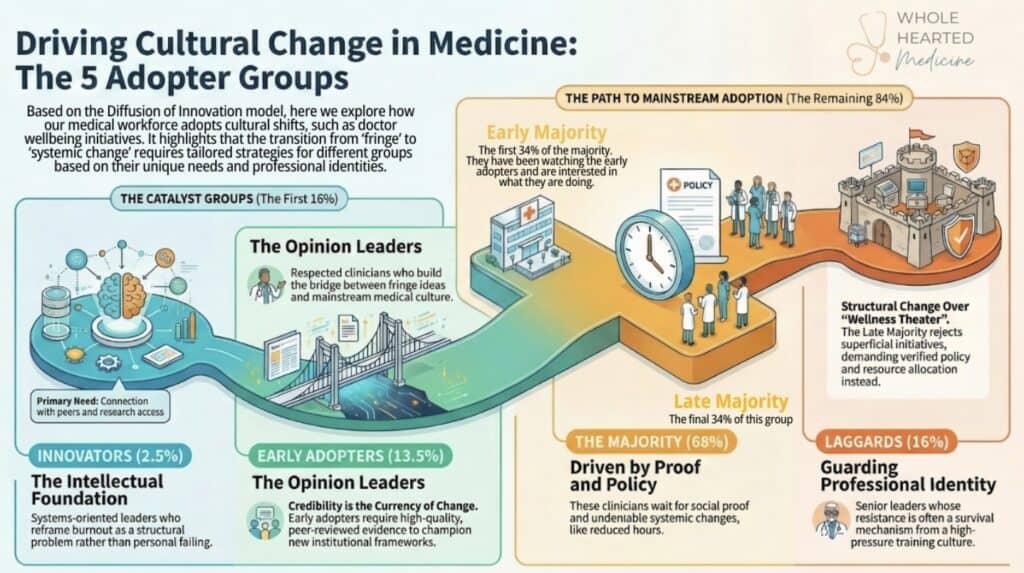 What will reach the late majority is not more advocacy. It is structural, visible, undeniable change. Reduced working hours. Protected time for clinical supervision and peer support. Genuine psychological safety in reporting errors and expressing distress. A hiring and promotion culture that values whole physicians rather than simply productive ones. When the late majority see that the institution itself has changed, not just its language, they will begin to move.